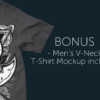 As a bonus, this pack includes a t-shirt mockup. This mockup is Men’s V-Neck T-Shirt Mockup from our Men’s Classic V-Neck T-Shirt Mockup Pack (featuring displacement maps); the style is flat front. A guide showing you how to use this mockup is included in the download.